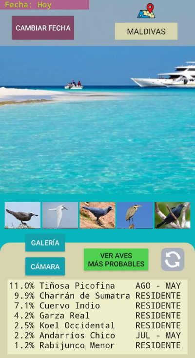 Basta con realizar una foto a una playa, un islote, una palmera, al océano, a un barco, edificios, etc. La aplicación te mostrará qué aves es más probable que encuentres ahí, podrás además cambiar la fecha al momento que quieres analizar.